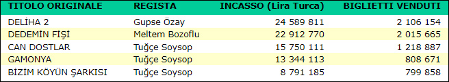 Turchia 2016 - 2021: tre donne e cinque film campioni d'incasso Il mondo contemporaneo è intriso di classifiche in grado di soddisfare praticamente ogni tipo di curiosità: MEDIA Salles, partendo dalla lista dei 100 film più visti in Turchia dal 2016 al 2021 messa gentilmente a disposizione da Antrakt, presenta, tra i 56 titoli turchi che vi compaiono, le produzioni dirette da donne che abbiano riscosso il maggior successo al botteghino: