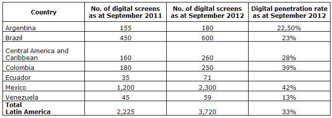 | Slow progress: Latin America's digital rollout varies dramatically by country A number of countries now report that their screens are 100% digital (e.g., Norway and the Netherlands), and in some major markets that percentage is up to near 80% (for example, the US, UK, France and Japan). Nevertheless, in Latin America the numbers for the digital rollout are poor and the speed of the process is slow: penetration is currently at 33% (23% if we don't include the three countries with the highest rate of screen digitization - Mexico, Colombia, and Ecuador). One year ago, the percentage in Latin America was 22% (20% excluding Mexico and Colombia). In fact, foreign exhibitors with operations in Latin America are privately negotiating VPFs for their own theatres with the majors. But national exhibitors (big and small) haven't reached any agreements. Only the very big circuits, like Cinépolis, Cinemex and Cine Colombia, have power enough to negotiate with the majors. Meanwhile, film producers in some Latin American countries complain that some big exhibitors (for example, Cinépolis and Cine Colombia) are charging a compulsory VPF for national releases (most of them produced and released with a lot of effort without much money). Some multinational companies are looking to offer VPF agreements and build a stronger presence in Latin America, like Sony (whose 4K projectors lack the same penetration as in other regions), Christie, Arts Alliance Media, Cinedigm and GDC. In contrast, Brazil is the only Latin American country whose national exhibitors have created a consortium to have more power for negotiating VPFs with the majors (like similar consortiums formed in the US, the UK, the Netherlands and Germany). Brazil is not only providing financial support for the digital rollout, but has also reduced import taxes for digital projectors. Those high taxes continue to be a factor in the rest of Latin America (increasing the cost of digitizing a screen to a final price between US$150,000 and $200,000). Argentina had announced state support for the digital rollout in the middle of 2011, but nothing has happened yet. Meanwhile, the Colombian Dirección de Cinematografía (national cinema agency) is working on an online platform to stream Colombian and Latin American films, a pioneer project in the region that won financial support from the prestigious Banco Interamericano de Desarrollo (BID). Moreover, in late 2011 Dirección de Cinematografía organized the first Latin American meeting of civil servants, businessmen and researchers devoted to accelerating the Colombian and Latin American digital rollout. Imcine, the Mexican national cinema agency, organized a similar meeting in March 2012. At September 2012, Latin America had 3,800 DCI-compliant digital screens (compared to nearly 2,500 at the same time last year). As in past years, Mexico and Brazil have the great majority of these digital screens: 78% (up from 60% in 2009). The chief factor is the Mexican rise (58% of these Latin American screens are in Aztec lands). On the other hand, digital screens in Latin American countries continue to be extremely concentrated in their capital cities and in their wealthiest regions. (The same is true of the overall exhibition market: on average, less than 10% of Latin American cities have some kind of cinema. Countries like Uruguay, Paraguay and Bolivia have only two or three cities with cinema screens and in Argentina, the eighth-largest country in the world, only 3% of their cities have cinemas.) Meanwhile, there is a slow growth in the percentage of Latin American digital screens projecting 2D films, especially in Colombia, Peru and Central America and the Caribbean (but it is still not much: an average 7% in all Latin American countries). As for individual circuits, Cinépolis is beginning to install "4D” screens (sensory stimulus) in Mexico and Brazil, while Cinemark is boosting their XD giant screens in almost all Latin American countries. Other companies, like Chile's Cinecolor and Brazil's Casablanca (audiovisual service providers), are developing satellite transmission of DCPs. Cinemark and Cinépolis are the companies making the strongest effort in installing digital screens throughout Latin America. North American's Cinemark has the major number of d-screens in Argentina, Brazil and Chile (in Chile the national company Cinemundo - owning 13 sites - has a similar percentage). At this time, Cinépolis is leading the digital rollout in Mexico and Central America. On the islands, Caribbean Cinemas has a strong position, as does Cinemark to a lesser degree. Main markets Nearly 42% of Mexican screens are already digitized. (It should be remembered that the Latin American digitization percentage average without Mexico is near 25%.) These numbers are being boosted by Cinépolis: The Ramírez family company announced that in 2013, 100% of their screens will be digital. (In September 2012, the percentage of digitized screens was around 65%, with two-thirds of Cinépolis screens in Mexico City already digital. Unusually for Latin America, Cinépolis has 100% digital multiplexes also installed in Brazil, Colombia, Peru and Central America - not to mention their theatres in the United States and India.) Cinemex is the second main exhibitor in Mexico, and the sixth-largest exhibitor in the world, with about 2,000 screens. This Mexican company is also increasing its digital rollout - nearly half their screens are digitized. Brazil has almost 600 digital screens (compared to nearly 450 one year ago), accounting for 23% of all their cinema screens. As stated above, Brazil is the only country in the region with two important advantages related to the digital rollout, common in other regions but unusual in Latin America: development policies such as financial help and tax exemptions to improve the process, and a consortium formed by national exhibitors to achieve a stronger position in VPF negotiations with majors. Fu